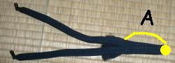 紐の端を曲げ、Aの上を通るようにして輪に通し、結びます。