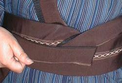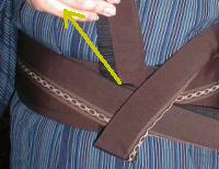 まず、帯(角帯)の端を1メートル弱ほど取り、垂らします(黄線部分)